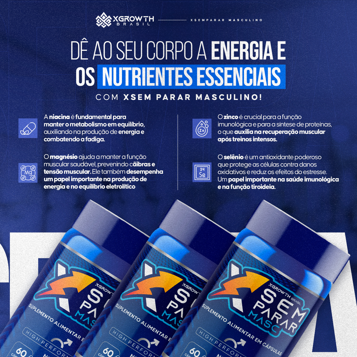 XSEM PARAR MASCULINO , desenvolvido com tecnologia de ponta pela XGROWTH BRASIL , é um suplemento de alta qualidade, com ingredientes cuidadosamente selecionados para proporcionar mais energia, resistência e equilíbrio ao corpo. Se você quer superar seus limites, aumentar sua disposição, foco, imunidade e ainda melhorar seu desempenho físico e mental, este é o suplemento que faltava na sua rotina!
